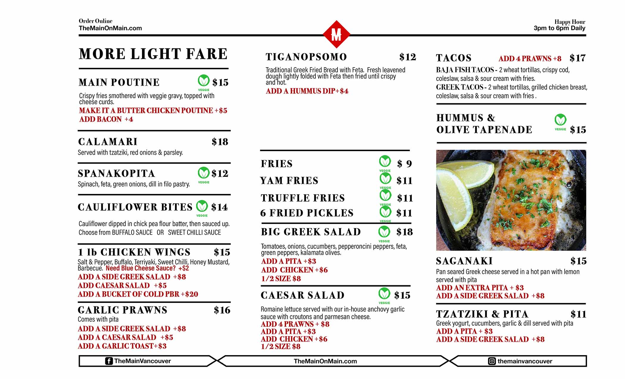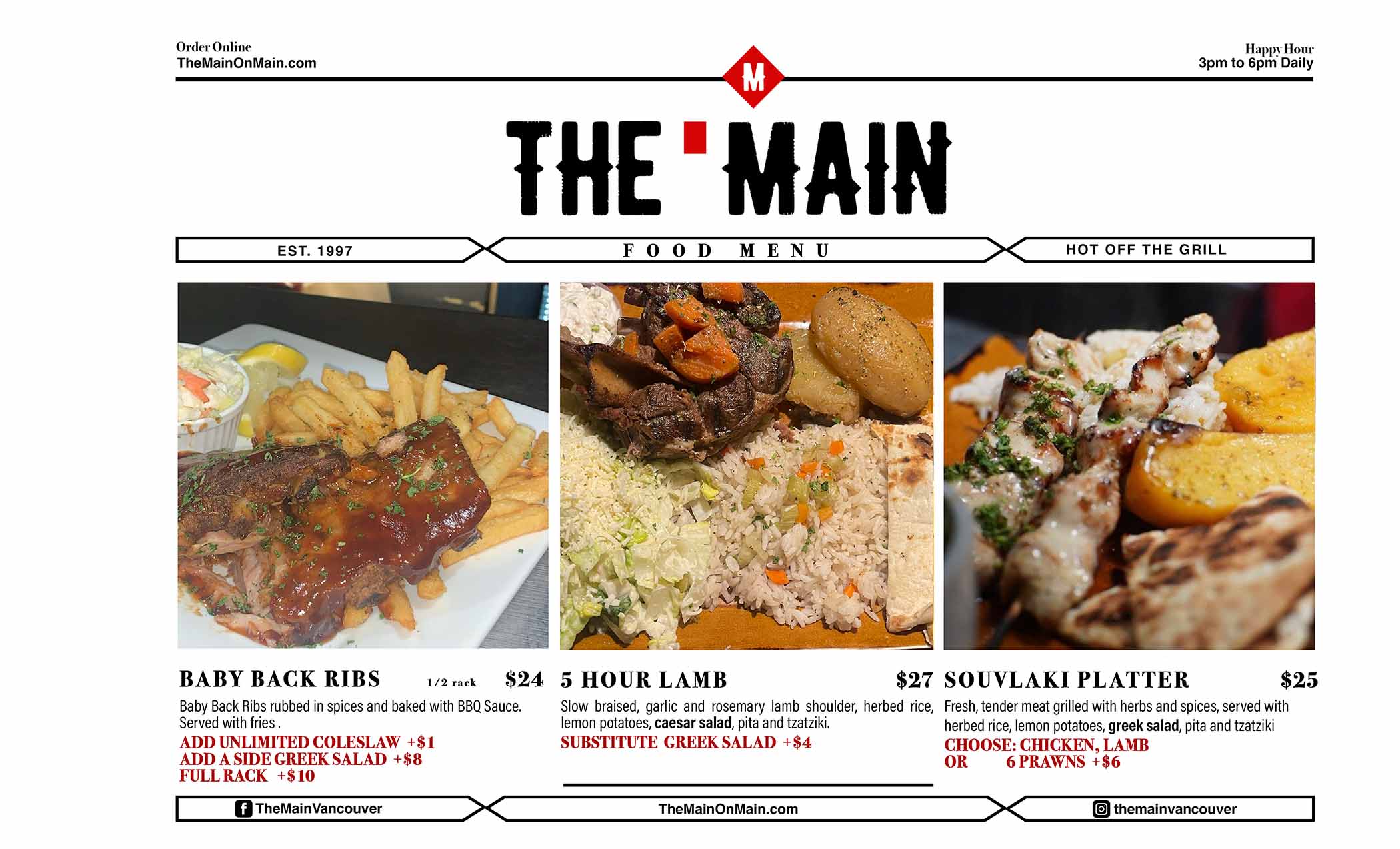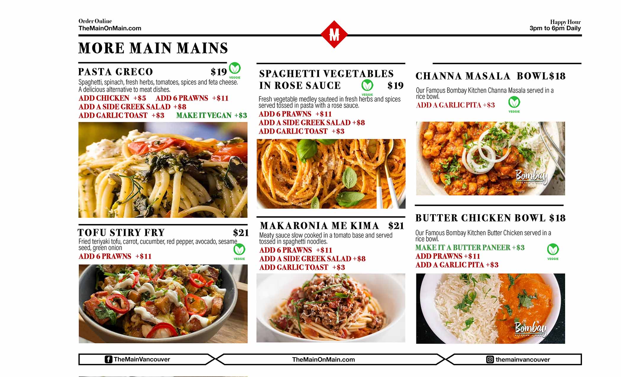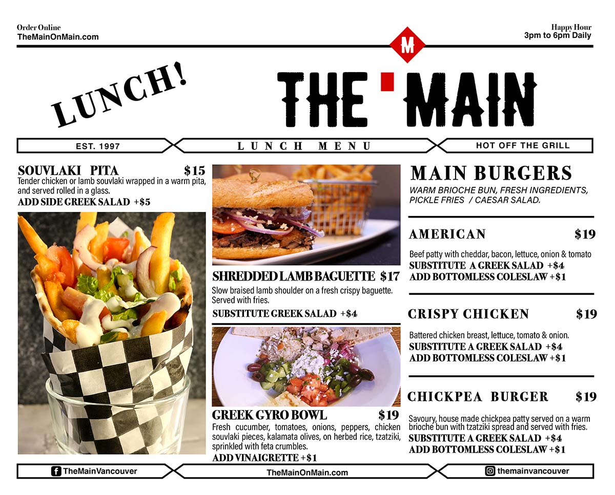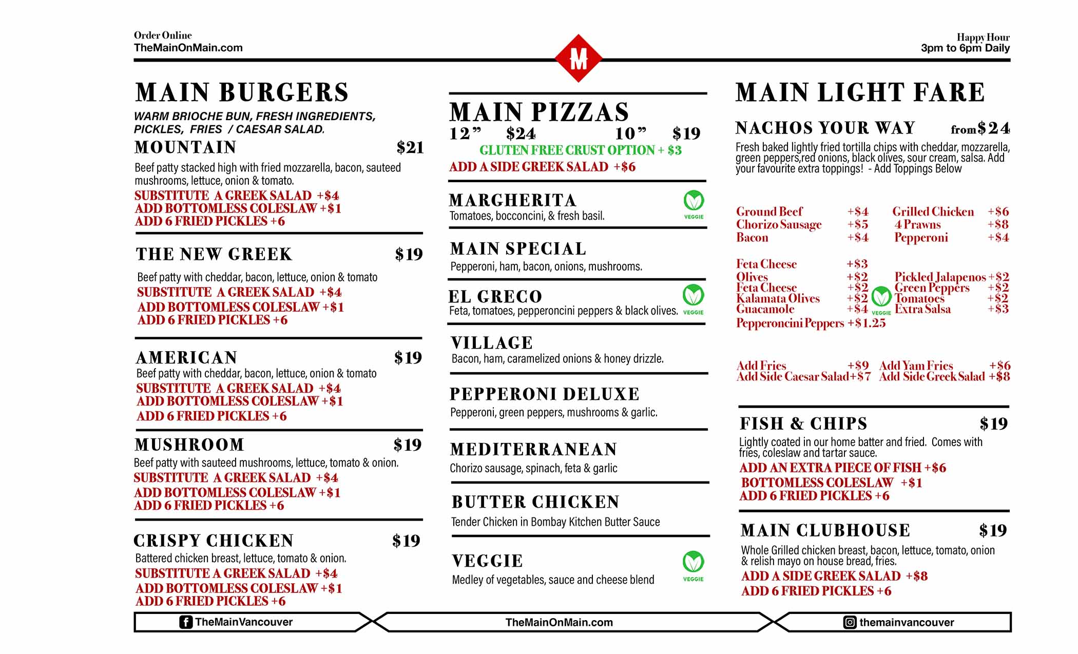 The Main on Main is offers a wide variety of delicious foods, including mouth-watering pizzas, juicy burgers, hearty mains, satisfying lunches, and flavorful dips. Our chefs use only the freshest ingredients to create meals that will leave you feeling satisfied and happy. Whether you're looking for a quick lunch or a tasty dinner, we've got you covered. Come visit us and experience the deliciousness for yourself!